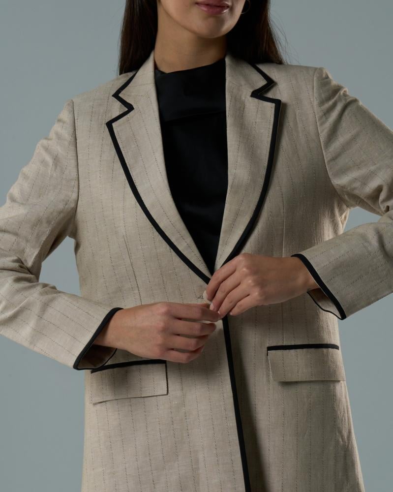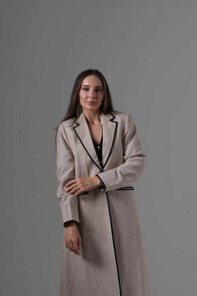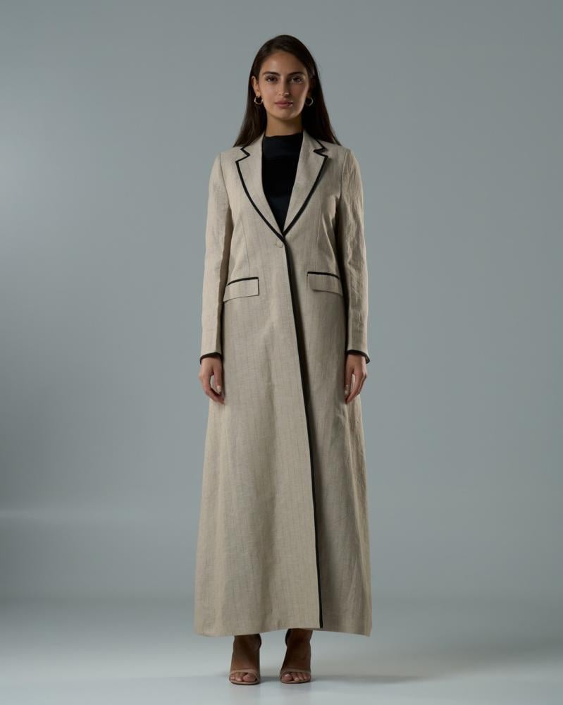 عباية حصرية من قماش لينن طبيعي ممزوج مع القطن بتصميم بليزر راقٍ وتفاصيل سوداء أنيقة، تجمع بين الفخامة والراحة لتمنحك إطلالة استثنائية لا مثيل لها.